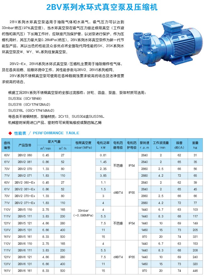 2BV水環(huán)真空泵適用于抽除氣體和水蒸氣,吸氣壓力可以達(dá)到33mbar壓力(97%真空度)。當(dāng)真空泵在吸氣壓力低于80mbar的狀態(tài)下長(zhǎng)期工作時(shí),應(yīng)聯(lián)接氣蝕保護(hù)管,以對(duì)泵進(jìn)行保護(hù)。如配大氣噴射器,吸氣壓力可達(dá)10mbar,噴射器可直接安裝在真空泵上。作為壓縮機(jī)用時(shí),其壓力大至0.26MPa。